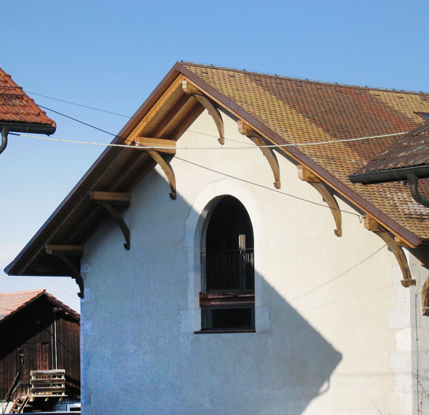 La charpente existante est conservée, certaines pièces ont été réparées, alors que les lattage et contre-lattage ont été reconstruits afin de créer une ventilation de la toiture isolée et permettre la réception d’une couverture neuve en terre cuite. Un soin particulier a été apporté aux détails de virevent et plate-bande afin de maintenir une faible épaisseur de ceux-ci.