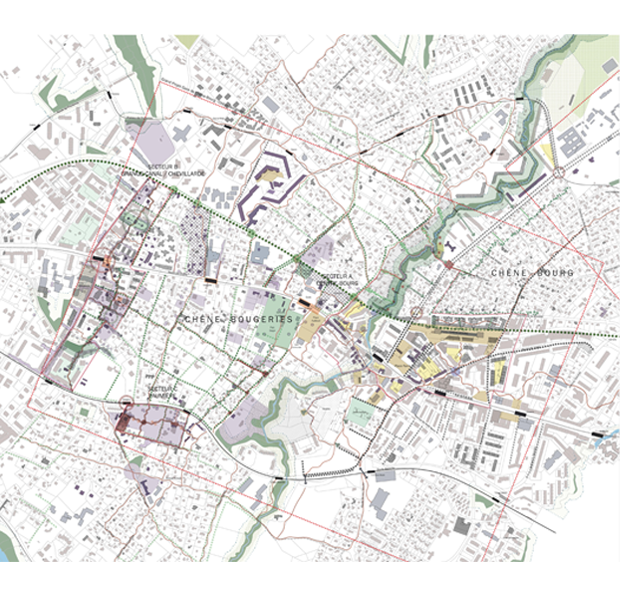 « Grands projets » dans les secteurs qui accueilleront les futurs développements. Le secteur de Chêne-Bourg et Chêne-Bougeries est l’un des 10 territoires identifiés comme stratégiques, en lien avec la ligne de train reliant la gare de Cornavin à Annemasse (CEVA), mais aussi de par sa localisation sur l’une des pénétrantes historiques de l’agglomération.